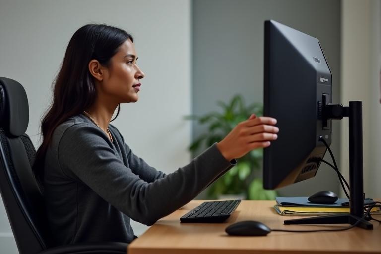 - Stelle die Höhe, Neigung und Drehung des Monitors so ein, dass die Oberkante des Bildschirms auf Augenhöhe ist.
