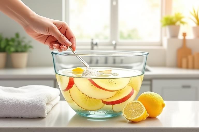 - Lege die Apfelscheiben für 2-3 Minuten in das Zitronenwasser, um ein Braunwerden zu verhindern.