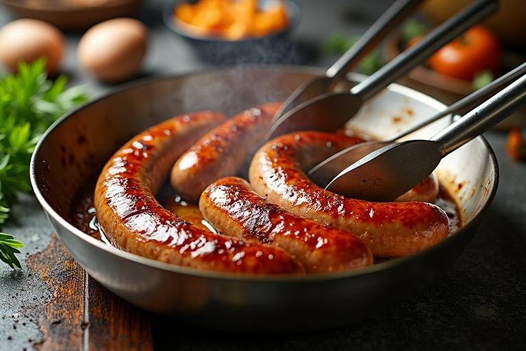 - Die Bratwürste vor dem Braten auf Raumtemperatur bringen.
