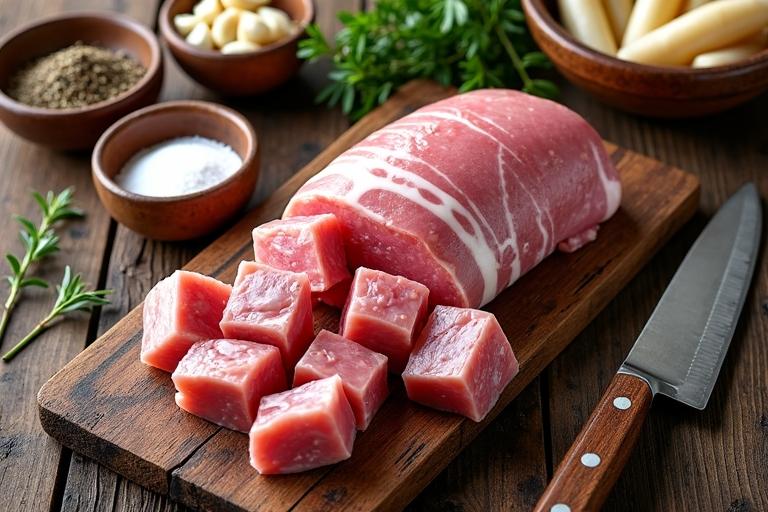 - Fleisch (Schweineschulter und Schweinebauch) in grobe Würfel schneiden, damit es in den Fleischwolf passt.