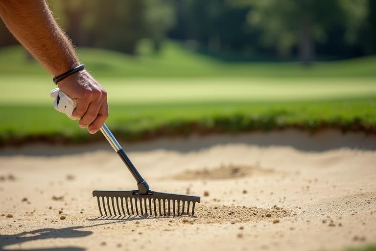 - Nimm einen Bunkerrechen und glätte alle Spuren, die du und der Ball im Sand hinterlassen haben.