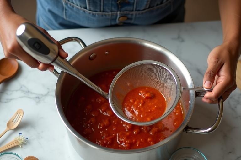 - Für eine besonders glatte Sauce die Masse durch ein feines Sieb streichen und in eine Schüssel geben.