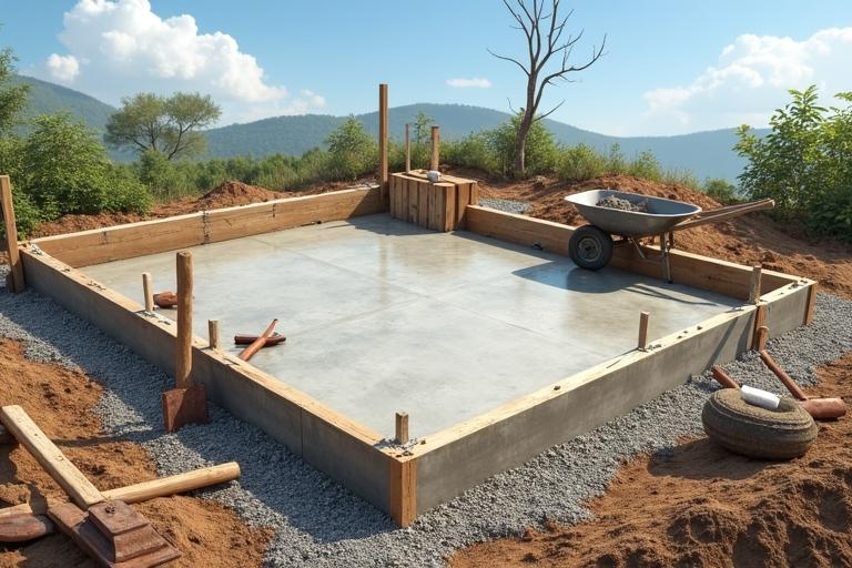 - Baue eine Schalung, gieße eine 15–20 cm dicke Betonplatte, achte auf eine ebene Oberfläche und lasse das Fundament mindestens 48 Stunden aushärten.