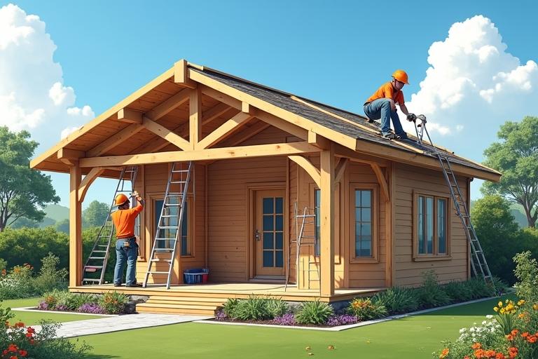- Montiere die Dachbalken und befestige die Dachschalung.