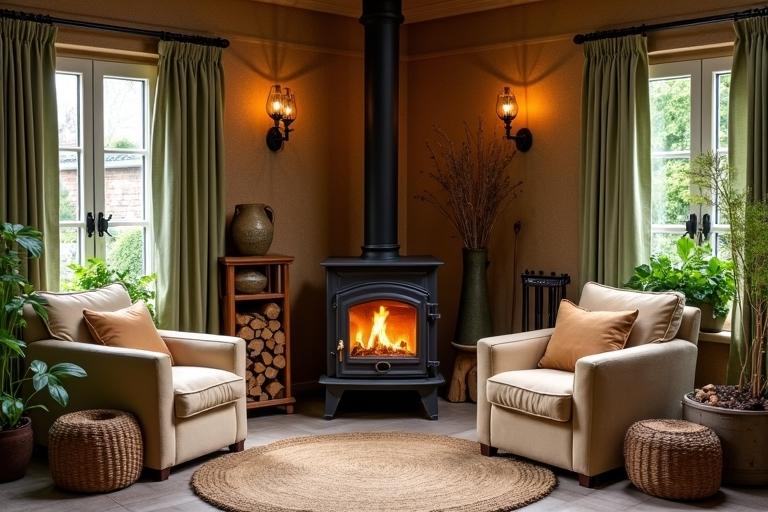 - Lagere trockenes Brennholz in einem kleinen Regal oder Holzkorb mit Abstand zum Ofen.