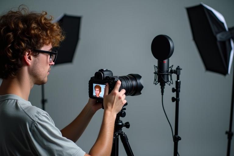 - Stelle Kamera, Mikrofon, Stativ und Beleuchtung bereit und richte sie auf den Aufnahmebereich aus.