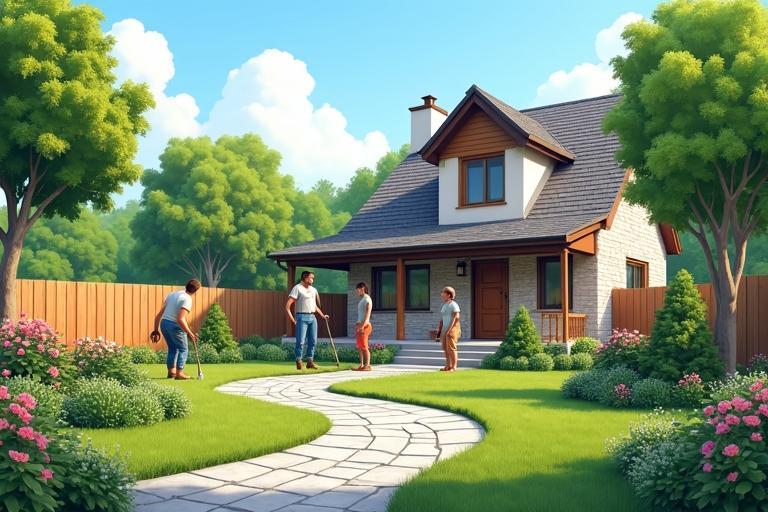 - Setze Zäune, Pflastersteine und Bepflanzung.