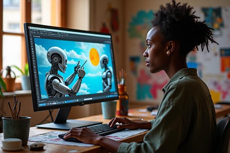 A futuristic robot painting a colorful canvas in a bright studio, digital art, high detail.