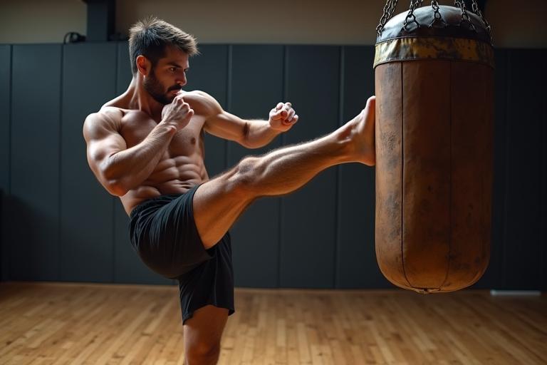 - Führe kontrollierte Low Kicks mit dem Schienbein gegen den Sandsack aus, beginne mit 10–20 Wiederholungen pro Bein.