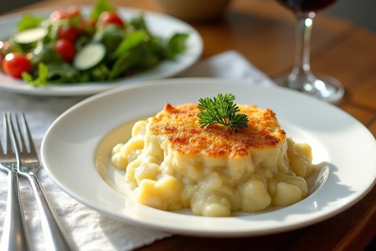 - Gratin in Stücke schneiden und portionsweise auf Tellern anrichten.