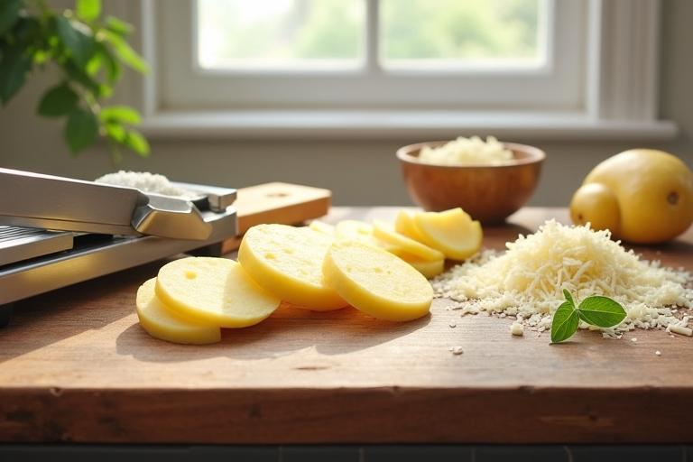 - Kartoffeln schälen und in dünne Scheiben (ca. 2-3 mm) schneiden. Am besten eignet sich hierfür eine Mandoline oder ein scharfes Messer.