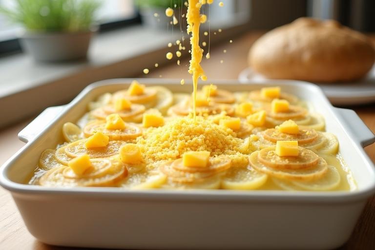 - Die Sahne-Milch-Mischung gleichmäßig über die geschichteten Kartoffeln gießen, bis alles knapp bedeckt ist.