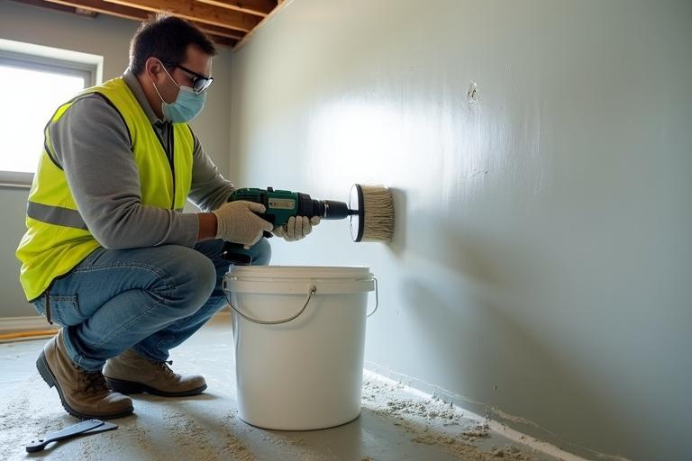 - Mischen Sie die Dichtschlämme gemäß Herstellerangaben mit Wasser in einem Eimer an, verwenden Sie einen Rührquirl.
