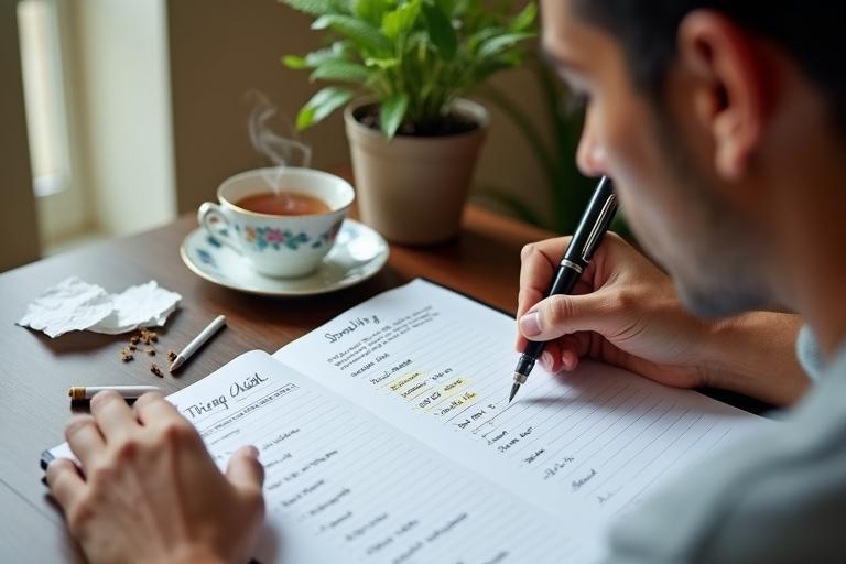 - Führe ein Rauchertagebuch: Notiere für mindestens drei Tage jede Zigarette, die du rauchst, mit Uhrzeit, Situation und Stimmung.