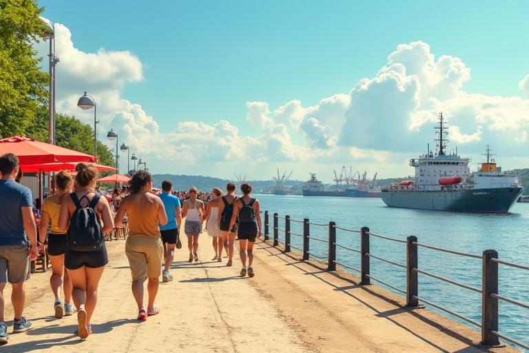 - Genieße den Blick auf vorbeifahrende Schiffe, Kräne und den Hafenbetrieb.