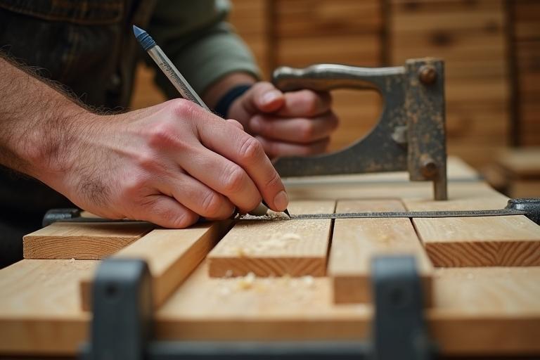 - Zeichne die Schnittlinien mit dem Bleistift an und fixiere die Latten mit Schraubzwingen.