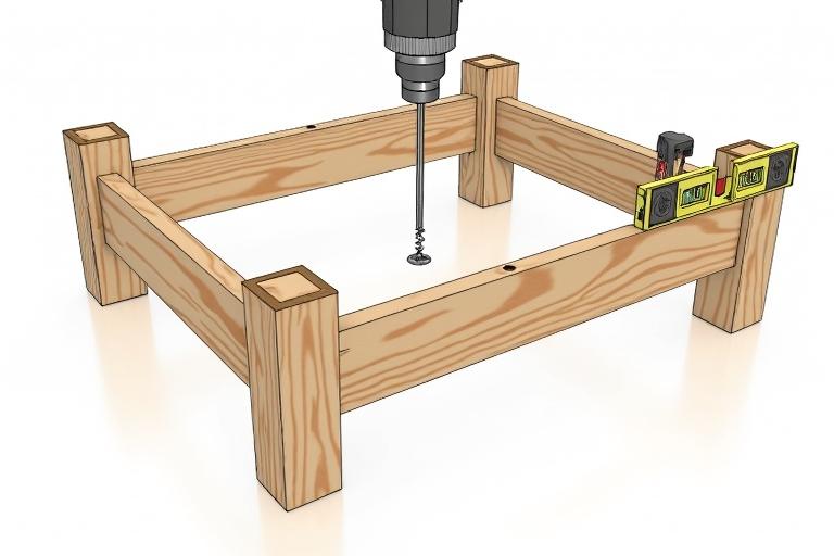 - Bohre je zwei Löcher pro Bein durch den Rahmen vor und verschraube die Beine mit Holzschrauben.