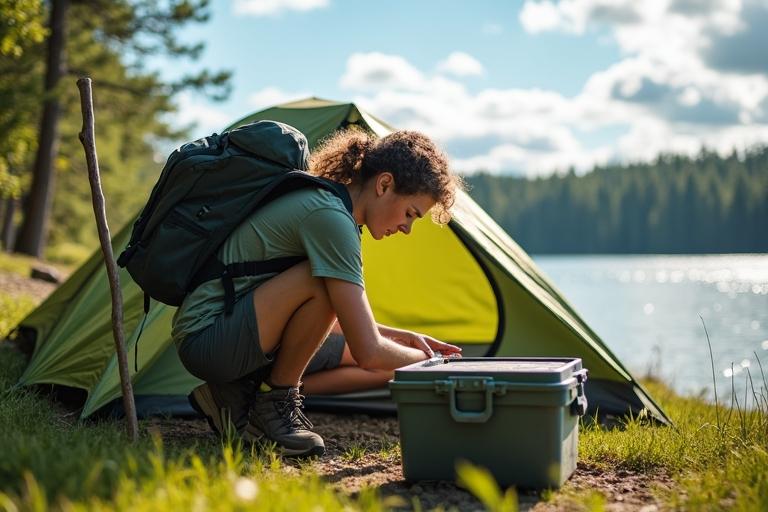 - Baue Zelt oder Ausrüstung sorgfältig auf und sichere alles gegen Wind und Wetter.